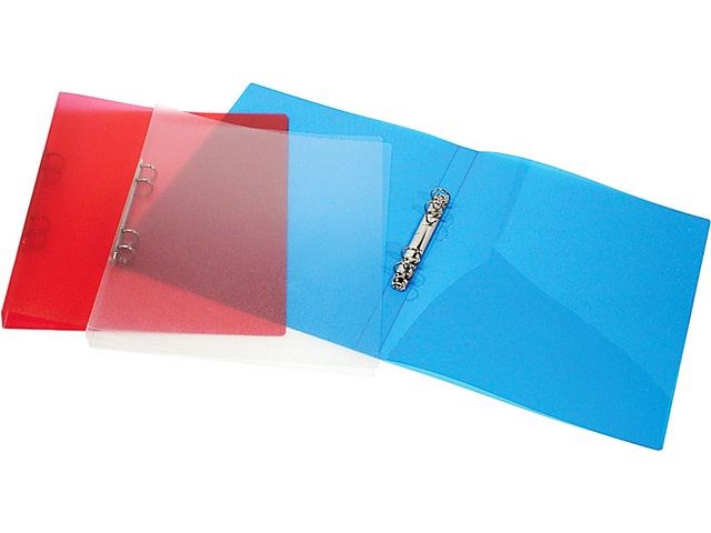 Mjuk böjbar pärm i transparent polypropylen. A4, ryggbredd 25mm, 16mm ringmekanismen. Röd/transparent.
