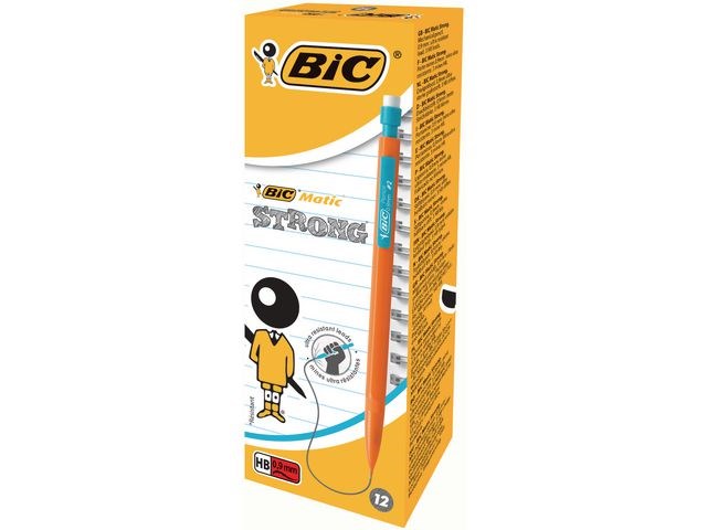 Den här BIC® Matic Strong-stiftpennan har ett inbyggt suddgummi och snygg design. BIC® Matic Strong passar utmärkt för dagligt skrivande. Blyet är extra starkt och extremt hållbart. Det bekväma greppet ger stadig hand, så att du kan skriva jämnt och tydligt. Pennans spets ger jämna linjer, så att föreläsnings- och mötesanteckningar blir klara och tydliga. Den automatiska blyertspennan innehåller 3 HB-stift och har både radertopp och en fickklämma.