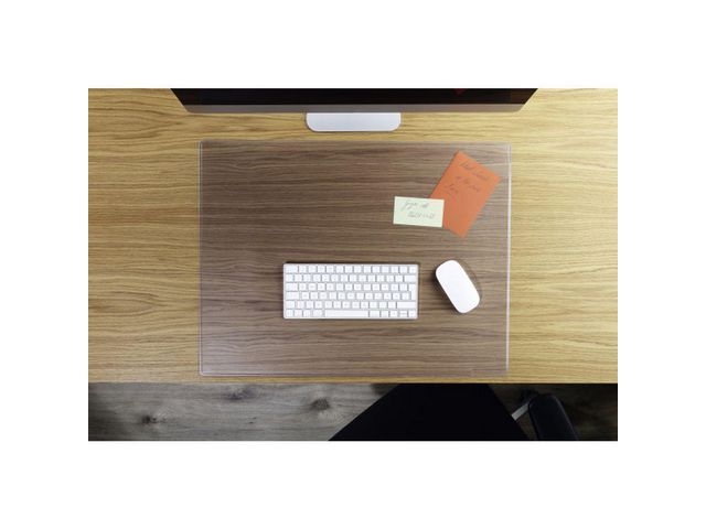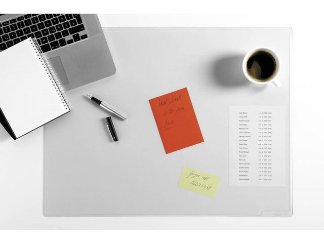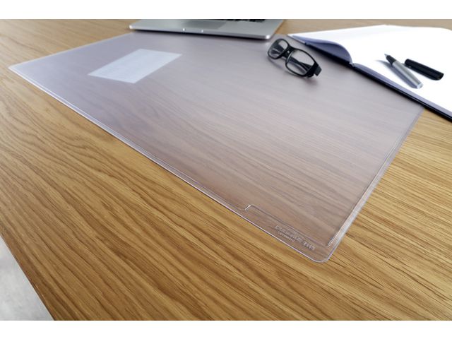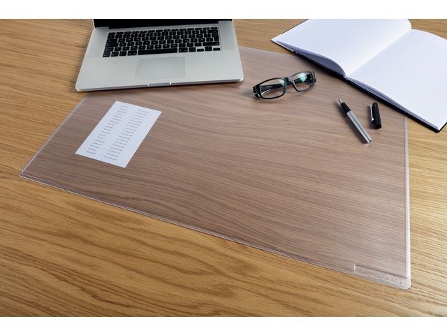Skrivunderlägg med antiglidskydd och antireflex behandlad yta. DURAGLAS® skrivunderlägg är transparent med en matt, ej reflekterande, yta. Det skrivvänliga underlägget skyddar, men döljer inte anteckningar, telefonlistor eller noteringar som förvaras under skrivunderlägget.