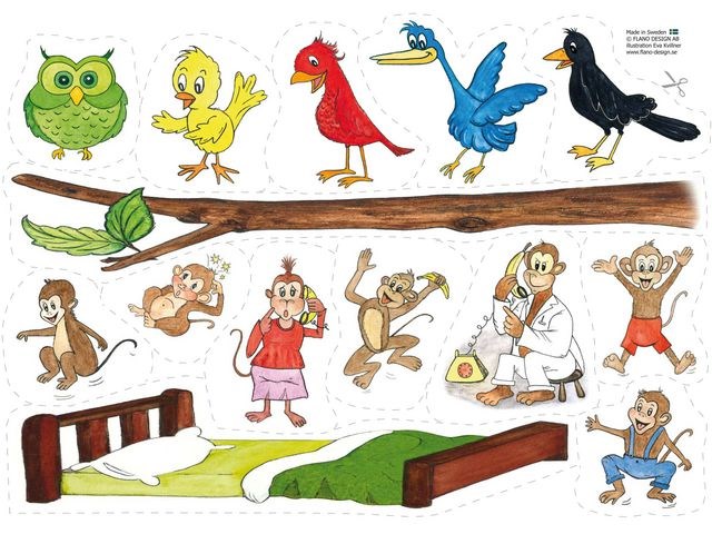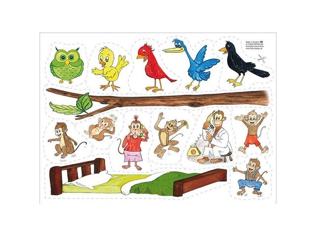 Flano med rim och ramsor: 5 små apor/ 5 fina fåglar, samt flanosång Var bor du lilla råtta? Öva färger och räkning med ramsorna. Samt sång med rim som skapar härlig dialog med barnen. Text medföljer. 2 st färdigtryckta flanoark om vardera 29 x 42 cm.