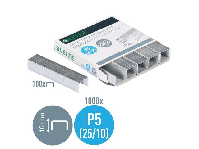 Häftklamrarna Leitz Power Performance P5 är tillverkade av högkvalitativt stål och håller upp till 60 ark åt gången. Använd dessa klamrar om du enkelt vill samla ihop flera papper. De här högkvalitativa 10 mm långa häftklamrarna är tillverkade av 25/10 stål och kan fästa upp till 60 ark 80 g/m²-papper. Idealisk för organisering av papper. Ha alltid en låda med häftklamrar från Leitz tillgänglig