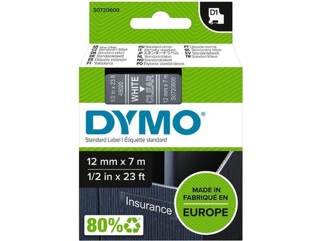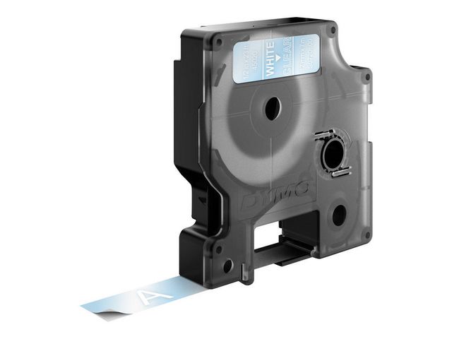 DYMO D1-etiketter erbjuder den prestanda och omväxling du behöver för alla typer av märkning, både inomhus, utomhus, på kontoret, i verkstaden, i butiken eller någon annanstans. Etikettkassetten DYMO® D1 på 12 mm ger snygga, skräddarsydda etiketter med vit text på transparent botten som passar perfekt för användning både inomhus och utomhus. D1-tejp med text som har skrivits ut med termisk överföringsteknik