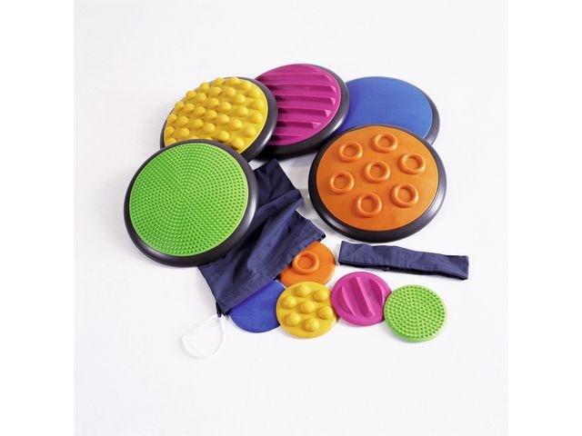 Balansplattor som tränas barnens känslighet i fötter och händer och hjälper till att utveckla förmågan att verbalt uttrycka sinnesuttryck. Balansplattorna innehåller 5 olika taktila strukturer i olika färger. Balansplattorna ger många lekmöjligheter, från grundläggande sinnesregistrering till minnes- och igenkänningsspel med förbundna ögon. Varje struktur finns både som stor skiva som läggs på marken, samt en liten skica som man även kan hålla i handen. Plattorna är tillverkade i konstgummi. Setet består av 5 stora skivor, 5 små skivor och en tygpåse Storlek stor skiva: 27 cm i diameter Storlek små skivor: 11 cm i diameter Tränar barns känslighet i händer och fötter ger många lekmöjligheter som tränar sinnesregistrering och minne